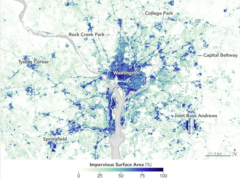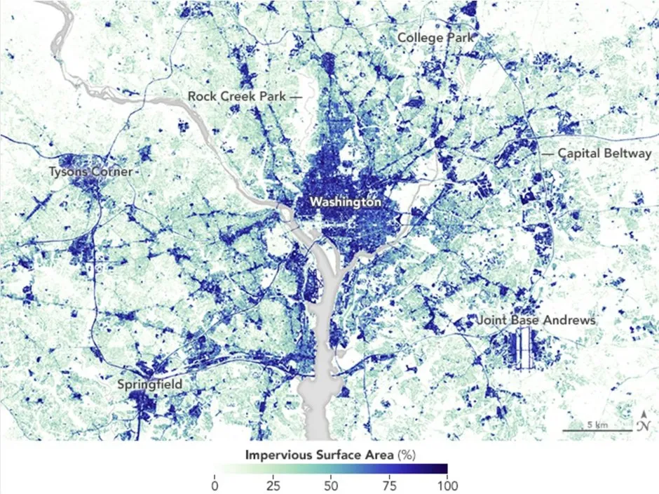 不透水的入侵是一个重要的问题,因为它可能导致环境问题——例如加剧 热岛效应——并改变暴雨水的自然流动以 引发洪水。该地区采取了 一些创新措施,以鼓励更多可以吸收雨水的绿地,但随着城市快速发展的步伐继续推进,这个问题无疑将继续成为华盛顿特区城市规划者的关注点。美国国家航空航天局写道: