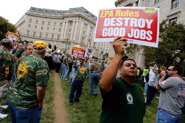 美国联合矿工工会的成员在2014年10月7日于华盛顿的美国环保署总部外抗议拟议的清洁电力计划。路透社 / 乔纳森·恩斯特各城市认为,解释这一条款以阻止环保署对电厂二氧化碳的监管,将违背清洁空气法的明确目的,即防止空气污染以保护公众健康和福祉。
