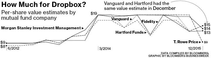 考虑一下云存储公司Dropbox。根据彭博社对证券文件的分析,其五家基金公司股东在16次场合中给出了不同的估值。在12月,T. Rowe Price对其持股设定了每股9.40美元的价值。同月,哈特福德金融服务集团则将Dropbox的估值提高了62%,达到每股15.20美元。