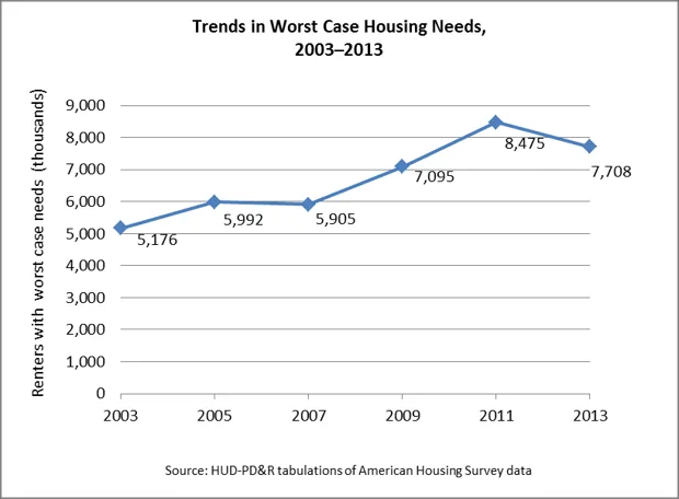 - 需求巨大: 根据 住房和城市发展部2015年向国会提交的最严重住房需求报告,生活在“最严重”住房情境中的美国人包括支付超过一半收入用于租金的家庭,以及生活在低标准或不安全住房中的家庭。在2013年,这一类别包括“280万有孩子的家庭,150万没有孩子的老年家庭,270万其他‘非家庭’家庭……以及70万‘其他家庭’家庭。”