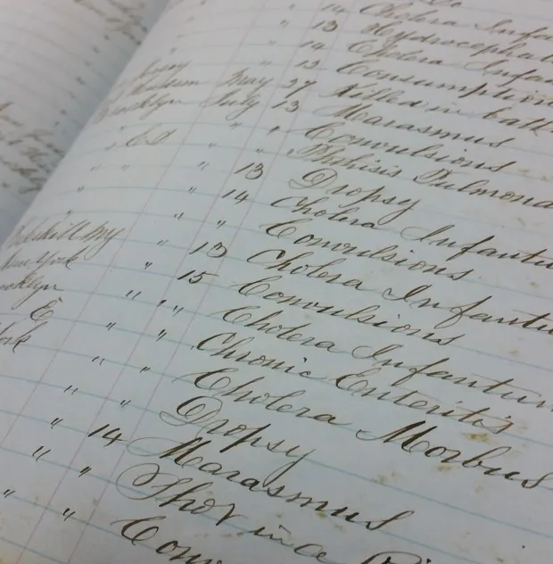 埋葬登记册的页面列出了死亡原因。格林伍德公墓这些记录还为任何对人口统计感兴趣的人提供了丰富的信息。被称为按时间顺序排列的埋葬登记册的超大书籍,详细记录了出生、年龄和死亡原因。1863年7月的一些条目将死亡原因列为“在骚乱中被枪击”,这表明他们是在曼哈顿的内战征兵骚乱中被杀,Alpert说。这些记录在公共卫生方面也有应用,跟踪疾病爆发。此外,查看姓名和出生地点可以揭示布鲁克林和曼哈顿的移民模式。