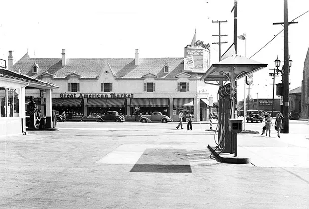 1936年左右,从一个角落服务站看到的伟大美国市场。洛杉矶公共图书馆在超市出现之前,杂货店与加油站相连,这意味着顾客往往是能够负担得起汽车的人。在1910年代,汽车工业在洛杉矶快速增长的住宅区蓬勃发展——但由于停车场和街道停车并不普遍,拥有汽车的家庭无法利用它们来处理日常事务。当时,加油站不过是位于主干道旁的专用开放空间内的泵。