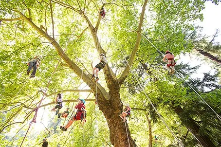 在波特兰的劳雷尔赫斯特公园进行的有指导攀爬。树木之友/Flickr有绳攀爬——无论是攀爬者还是指导教练设置适当的设备并遵循严格的协议——稍有不同。这个类别进一步分为个人或“有指导”的团体攀爬,但技术是恒定的,旨在促进安全。“如果攀爬者经过培训,并遵循国际树木攀爬者协会制定的标准,就从未发生过事故,”詹金斯说。
