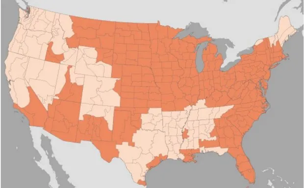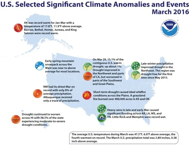 2016年3月温度地图上的一个惊人特征是这个月份的普遍温暖。美国本土和阿拉斯加的357个气候区划中的每一个,至少都进入了“高于正常”类别。这比听起来要难:这意味着这些区划中的每一个都进入了自己历史的前1/3。