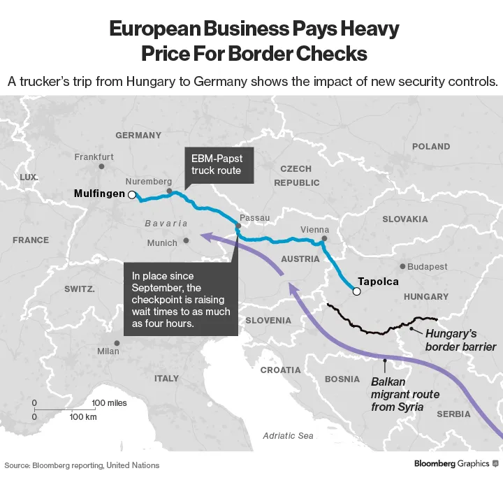 在运送风扇零件超过八小时后,Unczorg对延误已经没有耐心。而这一天比平常要好。他在这个去年九月设立的检查站经历了大约四小时的等待,目的是在靠近德国城市帕绍的A3高速公路上寻找 移民。这是他每天为电动马达制造商EBM-Papst集团行驶的路线。