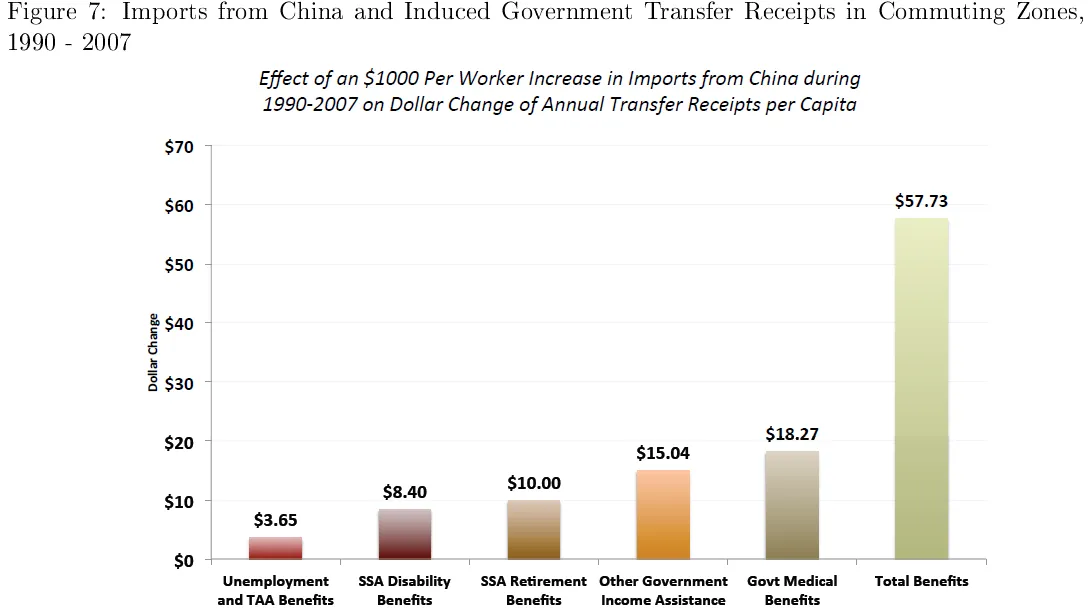 这是数学:从统计学上讲,每增加1000美元的中国进口,年转移支付大约增加58美元。这些支付不是施舍:它们是对工人、他们的家庭和社区在失去工作时所遭受损失的部分补偿。