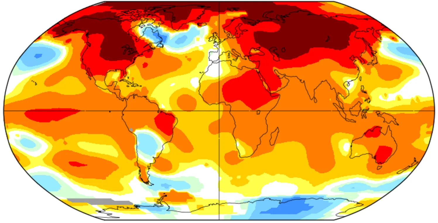 下面的地图,来自NASA,显示了热量在全球的分布情况。最极端的热量席卷了北极,那里冬季冰层达到了有记录以来的最低水平。在格林兰,冰层融化得如此之快,以至于科学家们最初认为他们的计算可能是错误的。