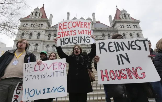 在纽约阿尔巴尼的国会大厦外,抗议者呼吁增加对支持性住房的资金。美联社照片/迈克·格罗尔但一些需求甚至更为广泛。受到心理疾病影响的人的住房短缺已达到危机水平,“我们知道,目前一些最大的机构已经介入为有心理健康问题的人提供住房的地方是监狱,”萨洛纳说。他和凯斯特尔一致认为,城市有责任提供具体的替代住房解决方案,以应对普遍的监禁。在丹佛,科罗拉多无家可归者联盟和文艺复兴住房发展公司合作建立了一个支持性生活公寓网络,为受到各种脆弱性影响的人提供现场服务。在接下来的15年里,ThriveNYC承诺开放15,000个支持性住房公寓。尽管如此,该倡议的路线图报告称,这一数字仍未能满足估计的需求。