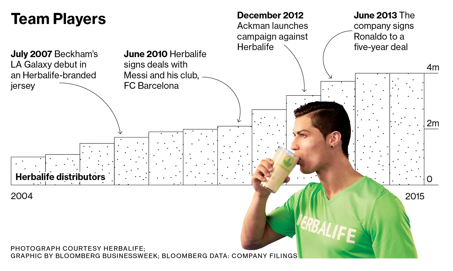 在贝克汉姆2007-12年在银河队的任期内,Herbalife的销售额翻了一番。其分销商数量也从150万上升到320万,足球热爱的国家带来了巨大的增长。约翰逊在2007年的投资者电话会议上解释道:“阿迪达斯在首次生产中制作了超过600,000件银河队球衣,而每一件都是一个移动的Herbalife广告牌。”显然,阿克曼没有在听。