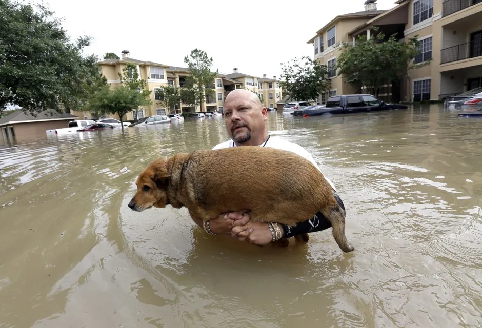 路易斯·马尔凯斯在2016年4月19日星期二,在休斯顿的洪水中抱着他的狗巧克力,救出了这只狗。美联社照片 / 大卫·J·菲利普在休斯顿周日和星期一遭遇的超过15英寸的降雨造成八人遇难,显示了提前洪水警报的重要性。