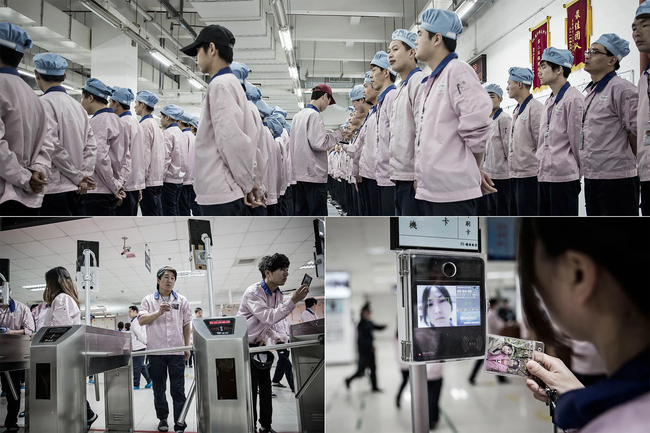 男女工人盯着面部扫描仪,并在安检闸机上刷卡打卡。严格的身份检查是为了确保他们不会加班过多。这个过程不到两秒钟。
