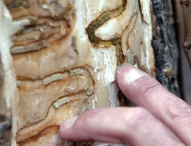 翡翠灰烬甲虫幼虫在它们侵扰的树木的树皮下留下痕迹。美联社照片/迈克·格罗尔,档案不过,保险通常不会在树木倒下之前支付砍伐费用。这意味着拥有几棵或几十棵灰烬树的人必须找到现金,在树木倒下之前将它们移除。有时城市甚至要求这样做。