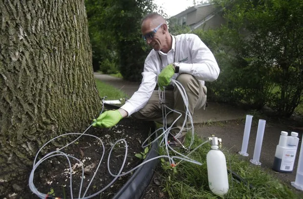 一名专家在克利夫兰给一棵白蜡树注射杀虫剂,以防止翡翠白蜡虫,2013年7月。美联社照片 / 托尼·德贾克另一种选择是等待树木死亡。但德朗说,这也行不通。如果翡翠白蜡虫出现并在大约同一时间杀死所有当地的白蜡树,这将给城市带来巨大的压力,迫使他们一次性砍掉树干,以免它们倒下伤人或损坏财产。为了避免对预算和人力资源的负担,城市开始在树木感染之前砍掉它们。这至少可以帮助他们按照自己的条件分摊成本,并开始种植其他物种。
