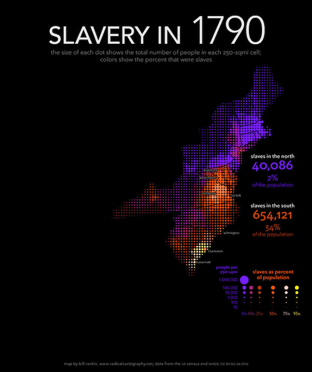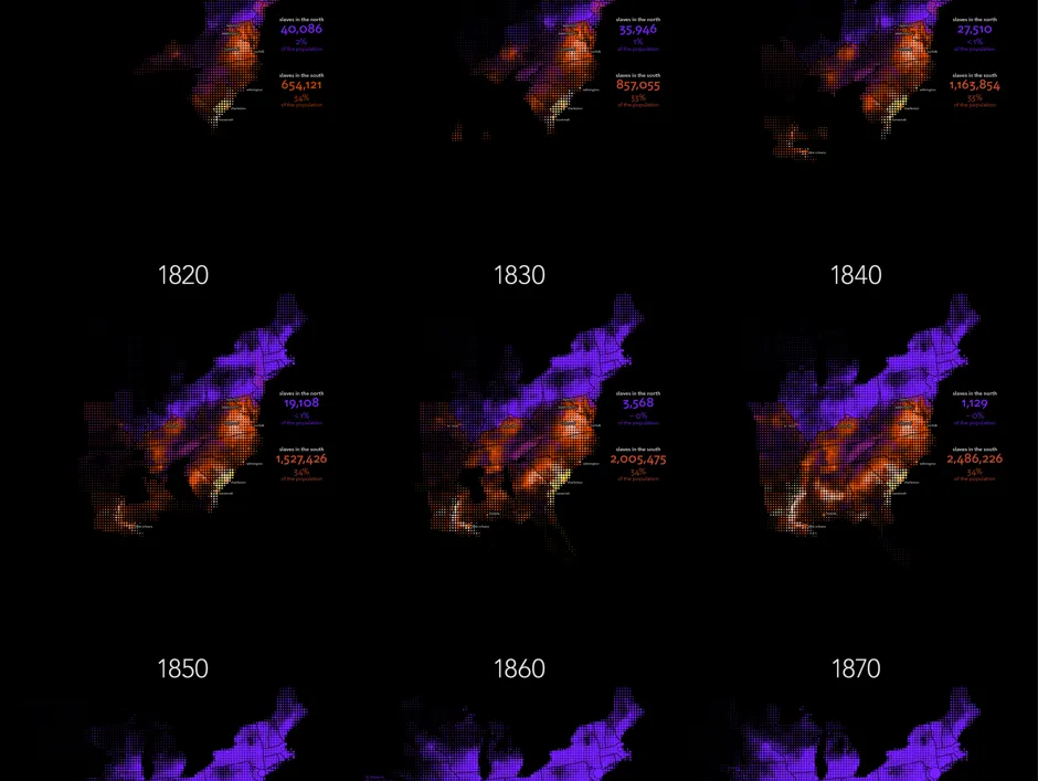 兰金的 新地图 提供了1790年至1870年间美国奴隶人口的快照,间隔为10年。但他的研究方法与 之前的 制图师不同,因为它不以县作为最小的分析单位。