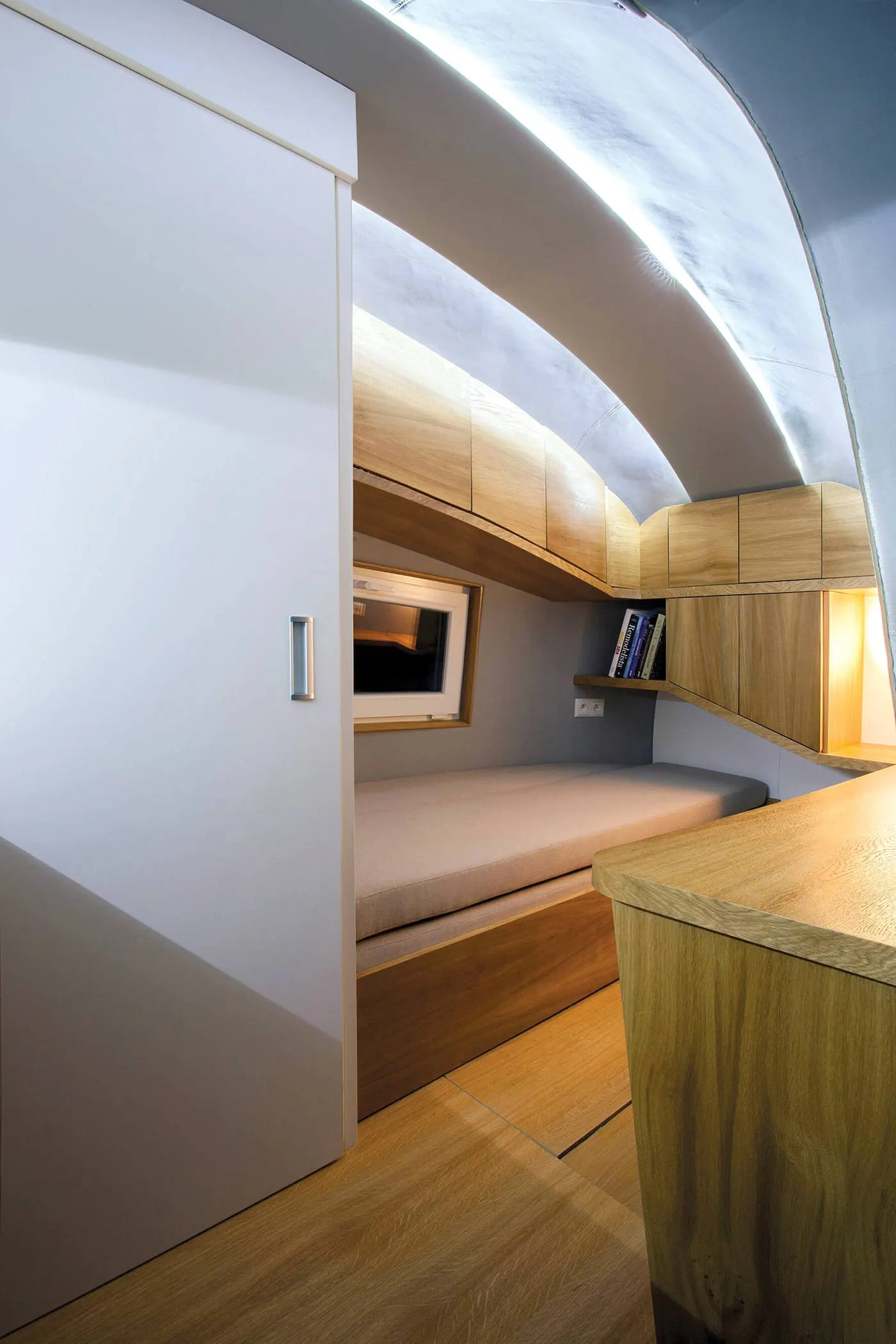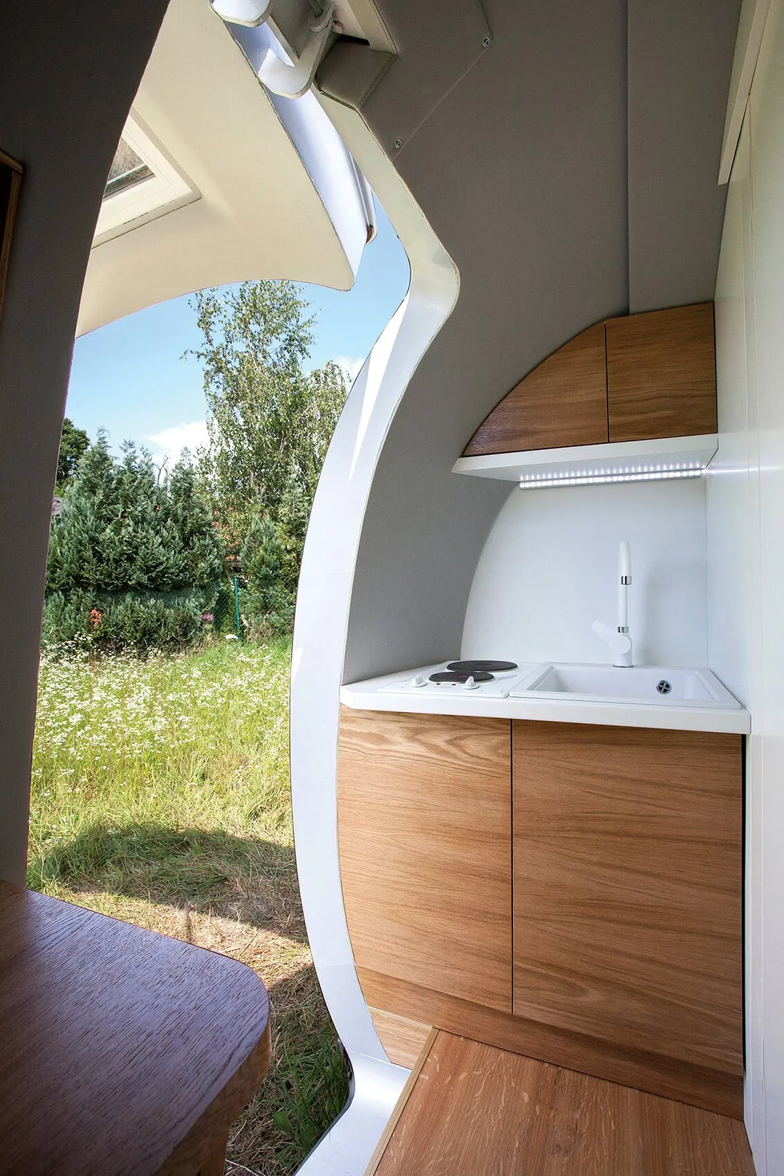 布局 通过15英尺×7英尺×8英尺的舱口进入,可以在一侧找到小炉子、厕所和淋浴,另一侧则有可折叠的床和桌子。胶囊的木质内部可以根据不同用途进行定制。