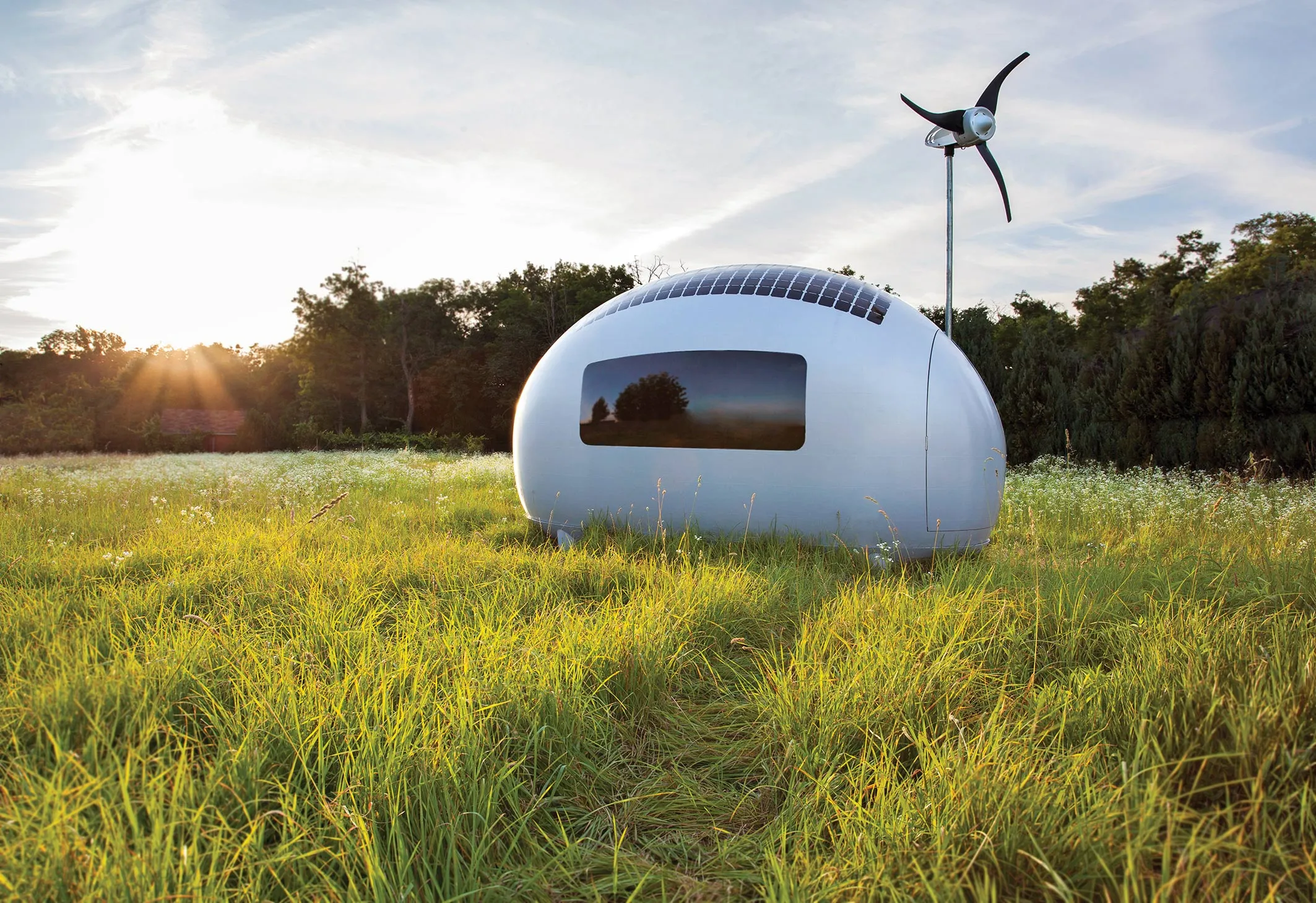 形式与功能生态胶囊由绝缘钢和铝制成,外壳为玻璃纤维,重1.1吨,面积70平方英尺,利用风能和太阳能供电,适合离网生活。