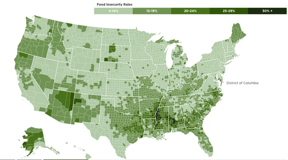 喂养美国报告中最相关的发现之一是,儿童的食品不安全率高于全国整体食品不安全率。在一些县,几乎42%的儿童面临饥饿。因此,国会的立法者推动 削减免费和减价午餐项目在学校——这一举措可能会使 数百万美国低收入儿童的处境更加糟糕。