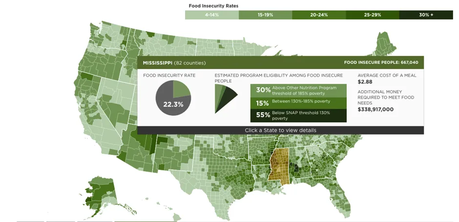 美国饥饿救助组织的互动地图有助于说明这些发现。它还显示了食品不安全率与贫困和失业等经济指标的关系,以及餐饮平均成本的地区波动(每餐费用可以在2到5.6美元之间)。根据报告的摘要: