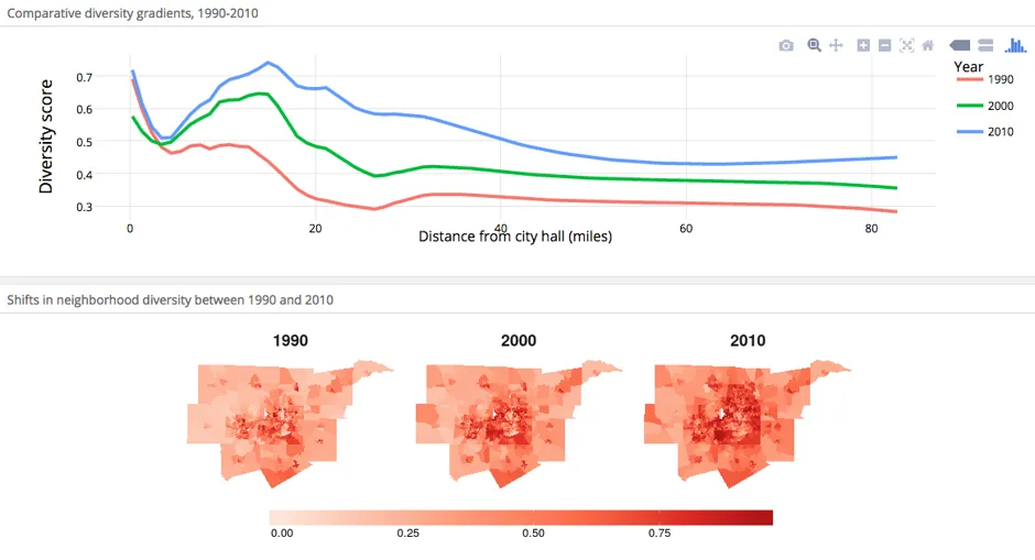 凯尔·沃克该工具还允许用户比较多样性渐变随时间的变化。在达拉斯-沃斯堡,郊区的多样性在1990年至2010年间急剧上升: