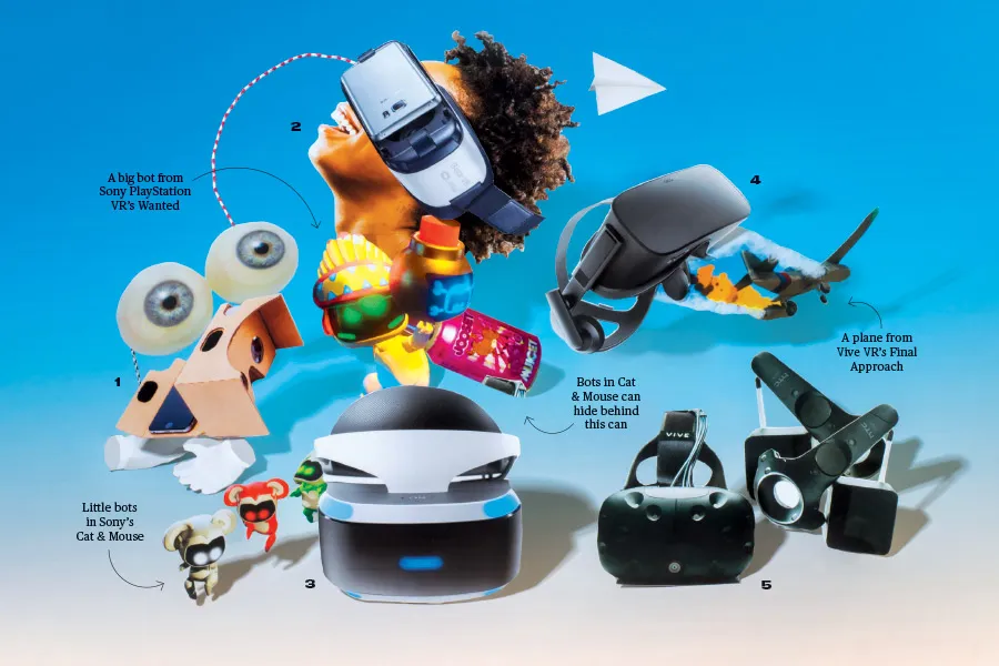 照片插图由Trey Wright为彭博商业周刊制作。耳机图片由品牌提供。剪裁:索尼(3);Vive(1);Getty(2)1. 谷歌纸板****价格: $15你需要: 一部至少运行Android 4.1或iOS 8.0的手机可用性: 现已上市详细信息: 谷歌的VR设备基本上只是一些折叠的纸板、两个玻璃镜头和一个智能手机的插槽。你还期望什么呢,$15?你把它举到脸前,而不是绑在头上,主要用于观看360度视频(难民营、政治集会等),而不是玩游戏。如果$15太贵,谷歌提供了制作自己耳机的说明,网址是 google.com/get/cardboard。如果你想: 了解一下这到底是什么情况,而不想花太多钱。