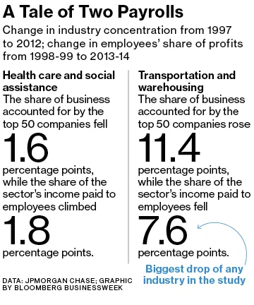 一个生动的例子是在运输和仓储行业。50家最大的公司在1997年至2012年间将其收入份额提高了超过11个百分点;然而,工人在该行业所增加的价值中的份额从1998-99年的平均水平下降了7.6个百分点到2013-14年的平均水平。该行业包括铁路和航空公司,这些行业经历了一系列重大的并购,集中在顶层的所有权。彭博情报的铁路分析师李·克拉斯科表示,它们已经变得“极其盈利”。工人通常工资较高,但人数较少,减少了劳动收入的份额,他说。