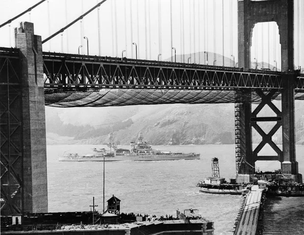 美国海军舰艇在1937年为金门大桥的开幕仪式做准备。美联社照片聚会的客人们享受了——或者说是被迫接受——一位魔术师、一段“独特的踢踏舞”表演、一系列模仿秀,以及,可能还有许多激动人心的“大会问候歌”的演唱,歌词如下: