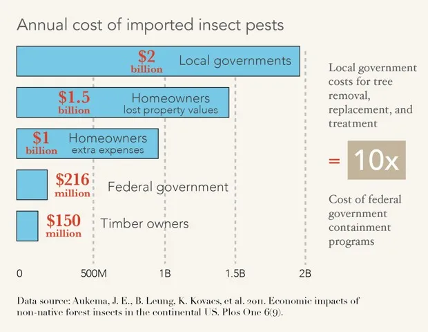 报告引用了一项 最近的分析,列出了入侵森林昆虫带来的年度费用(如下图所示):地方政府20亿美元,财产价值下降15亿美元,房主10亿美元,联邦政府2.16亿美元,以及木材行业1.5亿美元。
