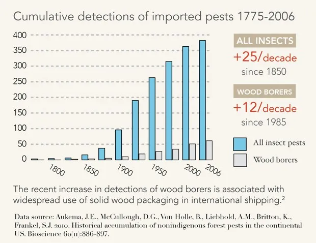 杀树昆虫多年来一直在海洋中搭便车,但过去三十年间,美国的进口率急剧上升,现在每年总计达到2500万个集装箱。随着贸易的扩大,寄生虫通过木质运输材料或嵌入进口植物的机会也随之增加。(它们的增加在下面的图表中有所记录。)一百年前,是栗子枯萎病和荷兰榆树病;今天,主要害虫包括翡翠灰虫、亚洲长角甲虫和冷杉毛虫。当这些昆虫到达并发现缺乏进化防御的树木时,它们可以在几十年内消灭整个物种。令人震惊的是,63%的美国森林现在面临 因入侵物种而失去树木的风险。