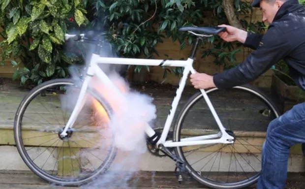 “自行车地雷”是伦敦的 雅尼克·里德的阴险创作,他是一位长期的自行车黑客,还制作了一辆带有 震耳欲聋的火车鸣笛的自行车,以及另一辆 对靠得太近的机动车喷射火焰的自行车。该装置由一段钛合金线、一个弹簧夹和一个通常在军事仪式和 皇家生日上发射的“致敬弹药”组成。它用魔术贴固定在你的车架上,当有人移动自行车时,会以150分贝的火花和烟雾的喧闹声引爆,如下所示: