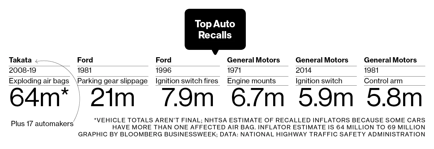 多年来,曾发生过其他高调的召回事件,例如通用汽车在2014年的缺陷点火开关和丰田在2010年的突然加速问题。但没有任何汽车安全丑闻像这个一样缓慢、故意地展开,然后似乎呈几何级数增长。罗斯金德表示,“美国车辆总量的很大一部分”需要被更换——大约6700万辆配备了气囊充气器的汽车。但即便如此,这也低估了情况的严重性。东京的杰富瑞汽车分析师中西孝树认为,日本和其他国家可能会效仿美国的做法,扩大自己的召回,增加5500万个充气器——全球召回总数达到1.22亿个。