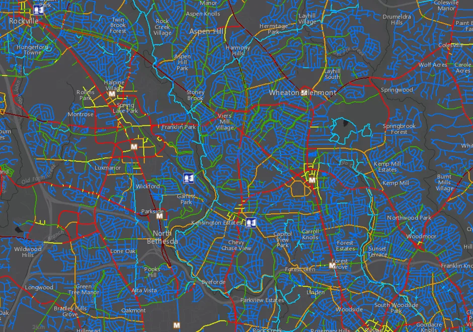 这张地图清楚地表明:蒙哥马利县的大多数地铁站仅对能够承受相对高压力水平的骑行者可达。资本共享单车站也是如此(尽管这些在地图上不可见)。蒙哥马利县的规划者斯蒂芬·图和交通咨询公司Fehr & Peers的亚历克斯·里克西通过使用地图和基础数据,识别出一些仅具有中等压力的街道,凭借少量低压力连接(可能以保护性自行车道的形式)可以显著扩大骑行者通往地铁和共享单车站的连通性和可达性。尽管他们的工作仍处于初步阶段,但这指向了一种更以数据驱动的方法来创建可靠的自行车交通。