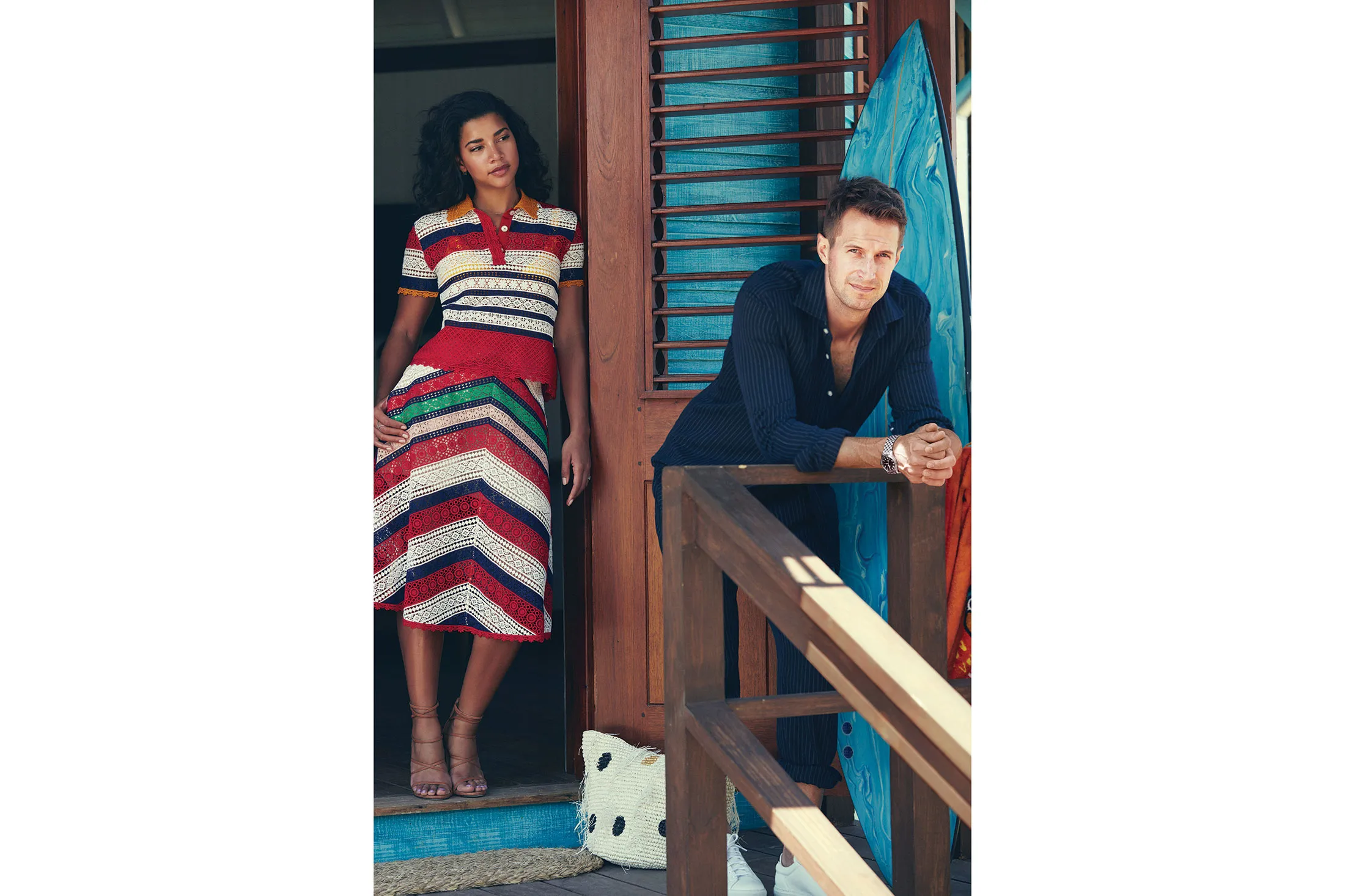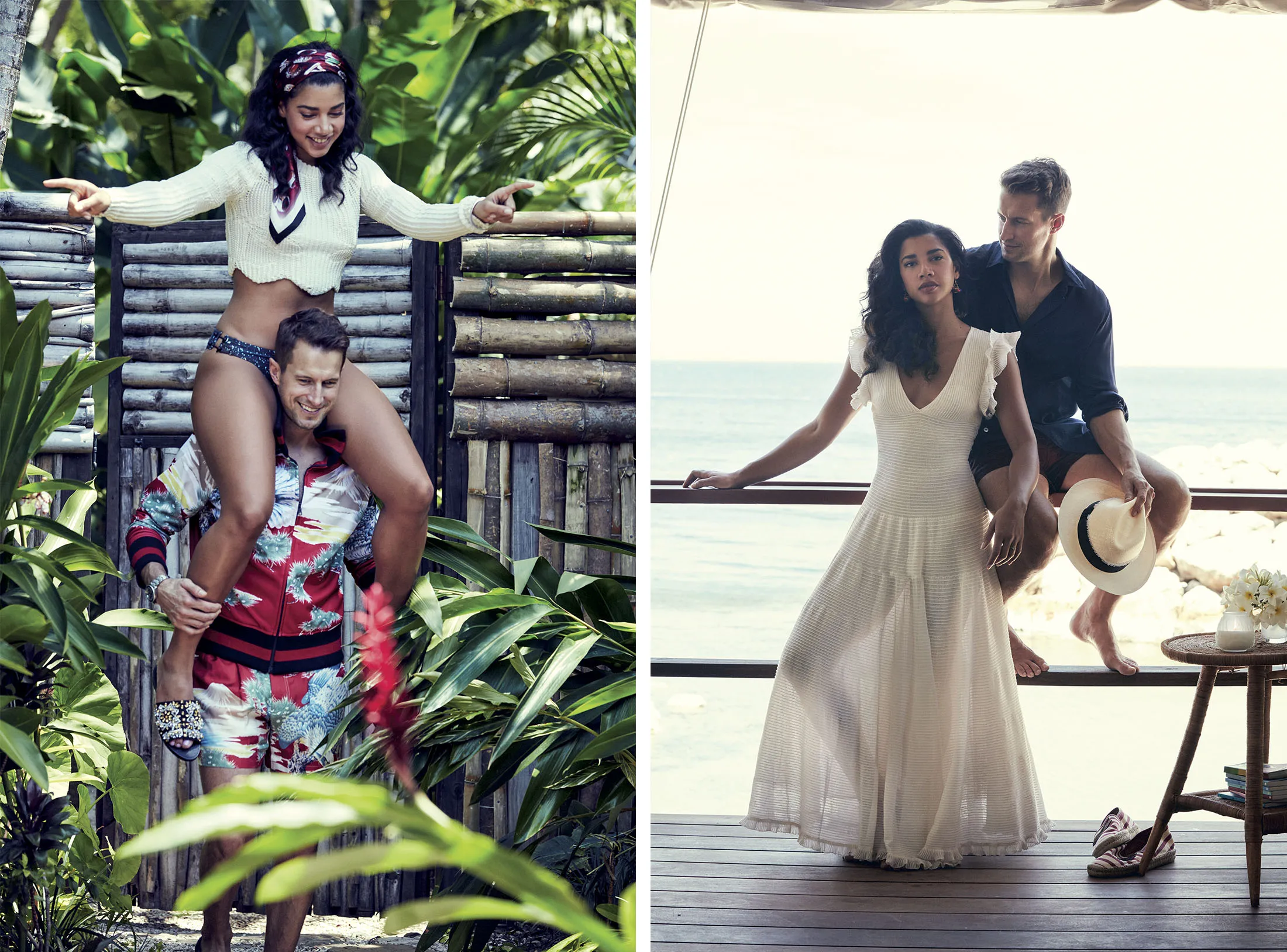 **左侧:**布朗夫曼穿着 克里斯汀·迪奥 的毛衣,泳裤由 普罗恩扎·舒勒 提供,丝巾由 保罗·史密斯 提供,拖鞋由 罗卡斯 提供。法利斯穿着一件丝绸夹克和短裤,均来自 古驰。 **右侧:**布朗夫曼穿着一件裙子,来自 萨尔瓦托·费拉格慕。法利斯穿着一件衬衫,来自 阿米,丝绸短裤来自 博利奥利,草帽来自 Sensi Studio,以及来自 古驰 的麻底鞋。