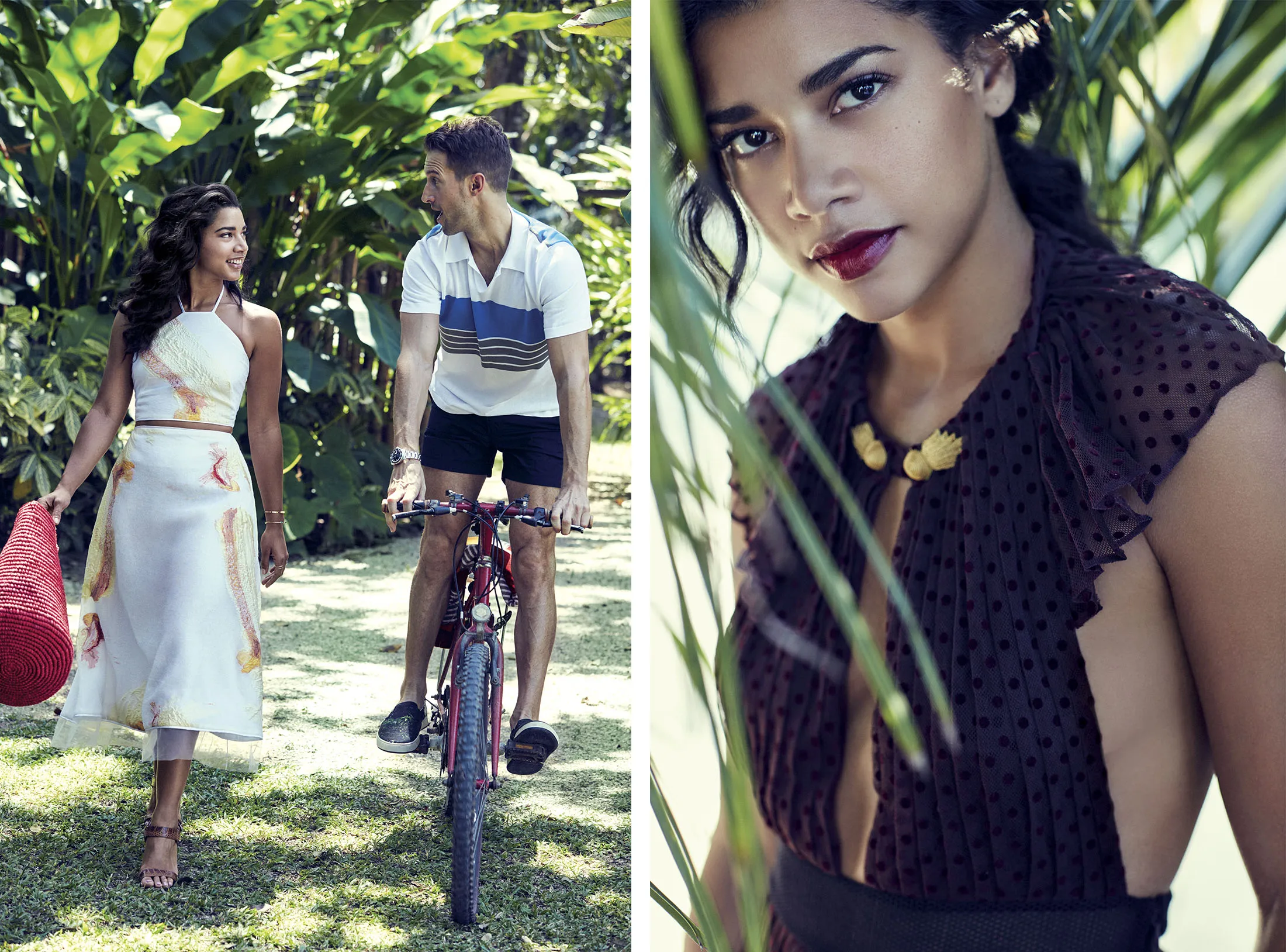 左侧: 法利斯穿着一件衬衫,来自 爱马仕,短裤来自 托马斯·迈尔,以及一双懒人运动鞋,来自 奥斯克伦。布朗夫曼穿着一件上衣和裙子,来自 普拉巴尔·古鲁恩,戒指来自 瓦莱,手镯来自 弗拉卡珠宝,以及一双皮凉鞋,来自 克里斯提·鲁布托。草编包来自 Sensi Studio。右侧: 连衣裙来自 博柏利。