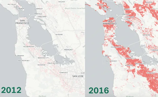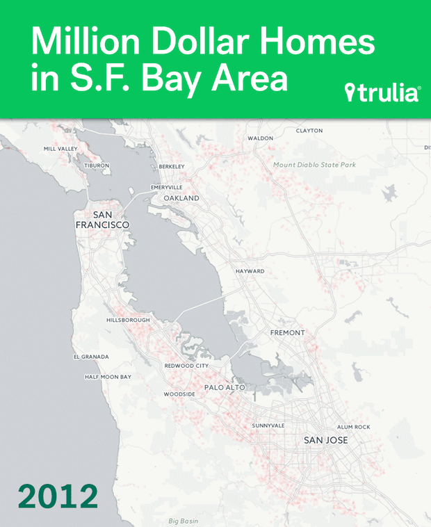 Trulia 有帮助地将这些数据汇总成一个可视化图表,显示出一百分之一的人口在湾区像皮疹一样扩散。