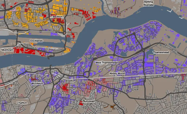在河的另一边,拥有尼日利亚背景的人(显示为紫色)沿着泰晤士河向东扩展,主要在其南部,而出生于立陶宛的居民(显示为橙色)则聚集在北岸。