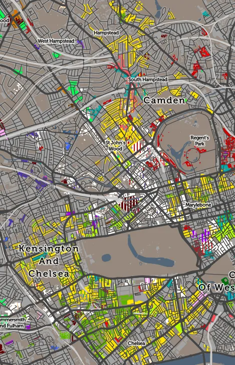 这里显示的集中情况很有趣,但在该地区的密度方面略显误导。该地图的南部区域,靠近海德公园,是伦敦第二密集的人口区。相比之下,北部区域则以大型历史单户住宅为主,即使现在这些房子常常被分割成公寓,居住的人数仍然远少于南部区域。虽然在后者地区的大多数外籍居民可能是美国人,但与城市其他地区相比,他们的数量并不一定很高。