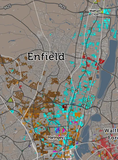 在其他地方,土耳其居民(显示为,呃,青绿色)分散在一系列区域,位于利亚谷。与东伦敦的孟加拉国人一样,这个地区的土耳其社区已经存在了几十年。然而,更新的是,保加利亚人(显示为棕色)和波兰人(显示为烧橙色)在他们的西部和南部集中,这两个群体大多是在他们的祖国加入欧盟后到来的。