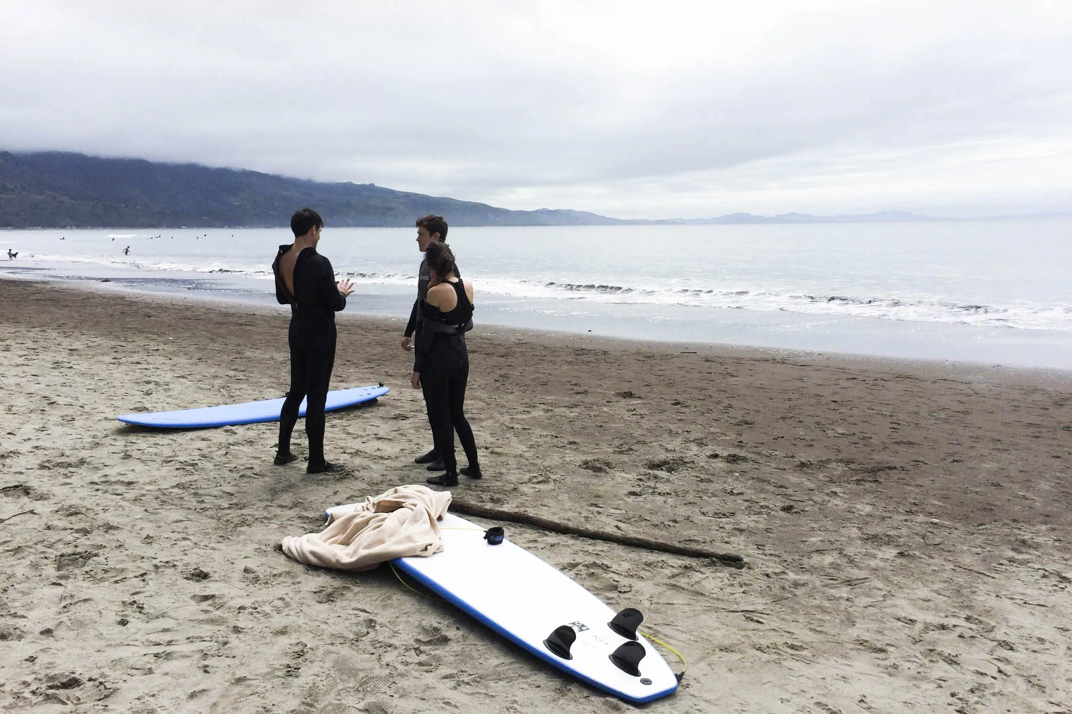 他们是演员还是当地人?准备在海滩度过寒冷一天的冲浪者。