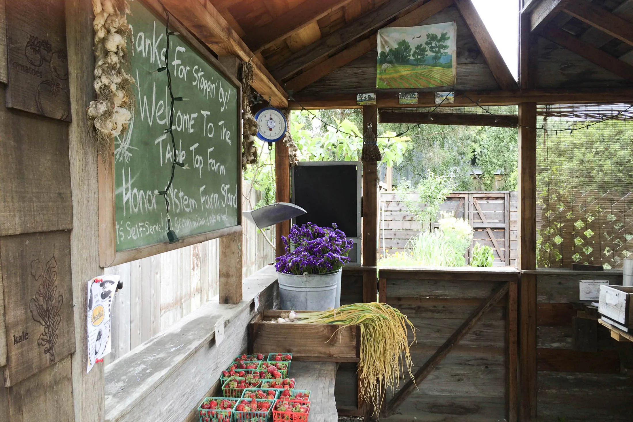 一个当地的农场摊位遵循荣誉制度:想要什么就拿走,留下你的钱。