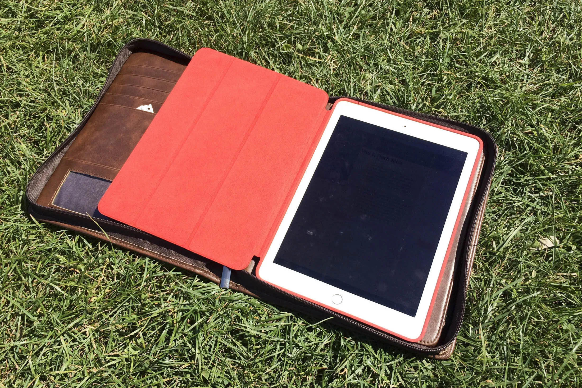一个皮革文件夹里装着我们可靠的平板电脑指南、一个笔记本,以及存放一两个线索的空间。摄影师:罗斯·加雷特在赛马场与萨莱会面是那个星期六早上的第一项任务,按照一台将作为我们整个周末指引的iPad的指示。它还将作为地图和目录,列出相关的参与者——他们都是塔利斯曼失踪的潜在嫌疑人——以及记录证据和发送、接收消息、视频通话,甚至从不同地点获取监控录像的手段。在整个周末,应用程序会根据我们的所在位置和需要做的事情进行更新,利用基于位置的触发器向我们发送提示,例如“跟随范斯的车”或“20分钟后在马厩与达斯汀会面”,这些提示会神奇地准时出现(尽管有一两个小问题)。
