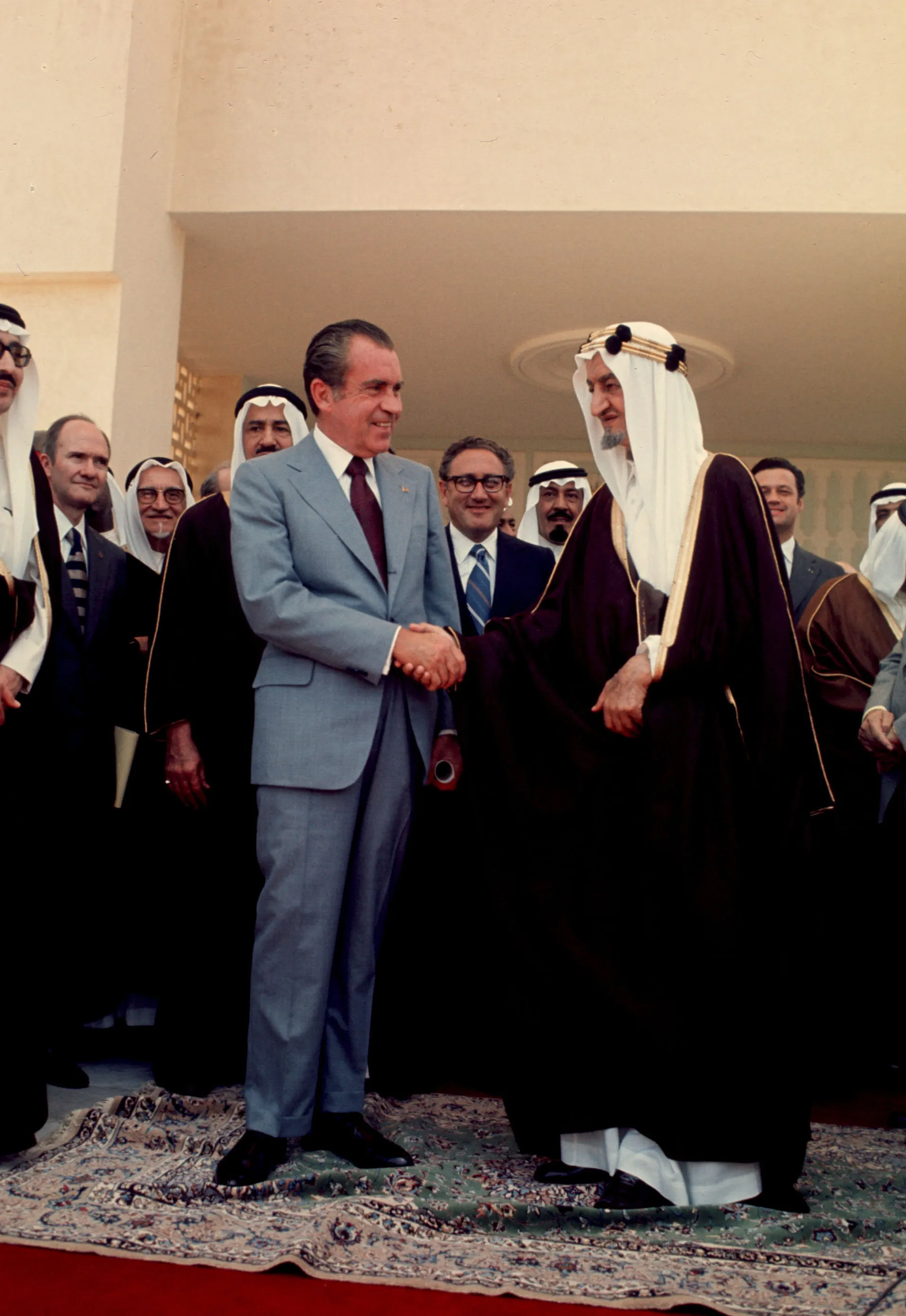 尼克松总统于1974年6月在沙特阿拉伯与沙特国王费萨尔握手。