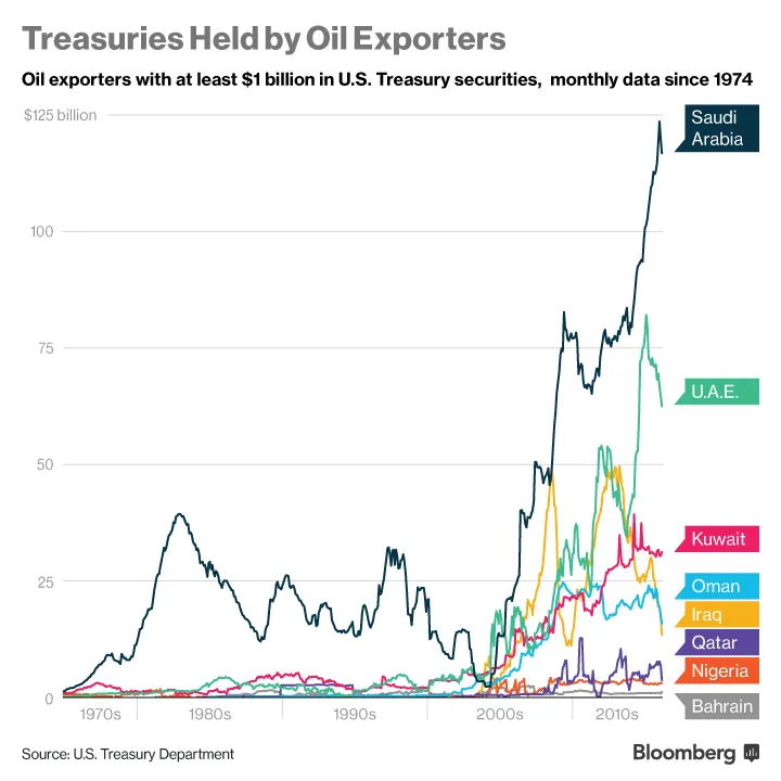 当财政部开始发布美国债务所有权的每月国家分解时,沙特阿拉伯被另行豁免。财政部没有披露沙特阿拉伯的持有量,而是将其与科威特、阿联酋和尼日利亚等14个国家归为“石油出口国”的通用类别——这一做法持续了41年。