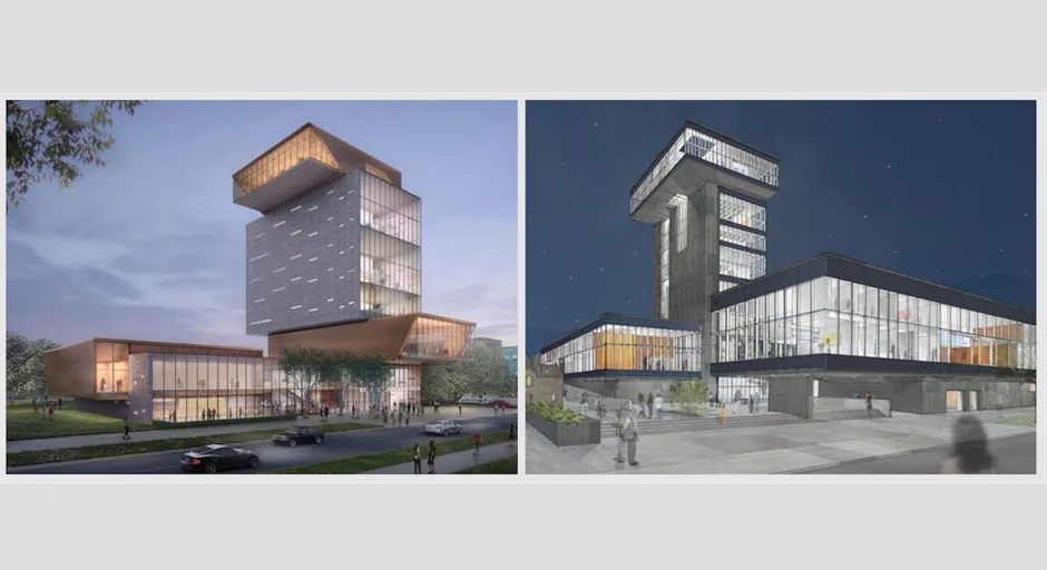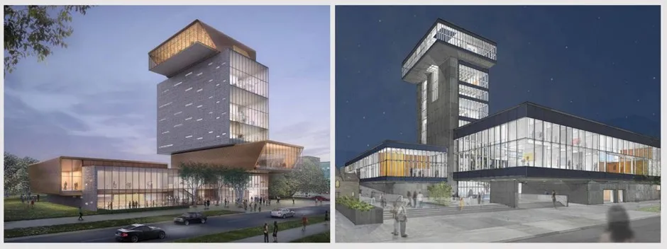 左:由Diller Scofidio + Renfro设计的David M. Rubenstein论坛。右:由Tod Williams Billie Tsien Architects设计的2007年Reva和David Logan创意与表演艺术中心的设计。芝加哥大学现在,重要的是要强调一开始就显现出的许多差异。各个项目空间(盒子)的体量和比例并不匹配。Tod Williams Billie Tsien Architects的设计(右侧)看起来像是一个低矮的中心,带有一个垂直的塔楼——至少在渲染图所示的角度上是这样。另一方面,Diller Scofidio + Renfro(右侧)强调了空间的杂乱。而且,不用说, Logan中心的最终设计是一个完全不同的存在:用石灰石砖建造,以呼应Frank Lloyd Wright的 Robie House,这也是芝加哥大学校园的一部分。