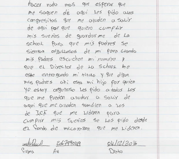 阿科斯塔的缺席并不是因为他不够关心,或者因为他没有通过考试。阿科斯塔将错过毕业典礼,因为自一月以来,他一直被关押在乔治亚州的一所监狱,移民和海关执法局(ICE)在他上学的路上逮捕了他。(事实上,阿科斯塔非常关心学校,以至于即使在监狱中,他 请求他的老师 给他 发送他的作业。拘留中心 拒绝了这个请求。)在给立法者的一封四月信中,阿科斯塔用西班牙语写道: