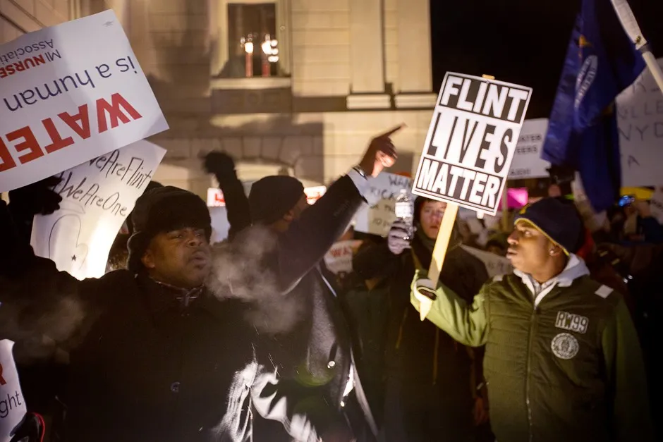 在州议会大厦外对密歇根州州长里克·斯奈德的抗议活动。HBO在即将播出的 VICE 的HBO节目中,新闻记者艾哈迈德·希哈布-埃尔丁在密歇根州弗林特报道,居民们仍在学习如何与 被有毒铅污染的水源共存——这是由 州任命的城市管理者 做出的决定所导致的。
