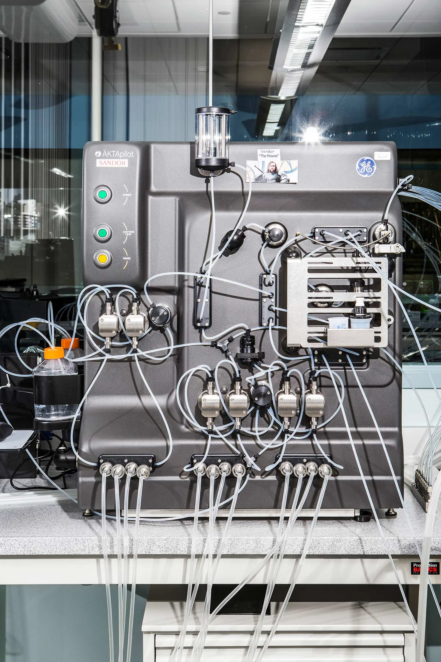 台式生物反应器。摄影师:杰里米·利布曼,供彭博商业周刊使用Regeneron花了二十年才获得美国食品药品监督管理局的首个产品批准,有时几乎濒临生存。重大突破发生在2011年,当时FDA批准了Eylea,这是一种用于治疗黄斑变性——50岁以上人群视力丧失的主要原因的药物。从那时起,Regeneron成为标准普尔500指数中表现最好的股票,股价上涨了2000%,超过400美元每股。去年,Eylea在美国的销售额增长了54%,达到了27亿美元,而公司的整体收入增长了46%,达到了41亿美元。Regeneron还有13个其他产品候选者在临床开发中,包括哮喘和关节炎治疗的后期试验。施莱弗表示,这是因为他和扬科普洛斯建立了一个罕见的药品公司,科学家们掌控一切。“乔治是我见过的最具创新性和创造力的人,”他说。“我的主要工作是创造一个让他施展魔力的环境,并尽量不去干扰。”