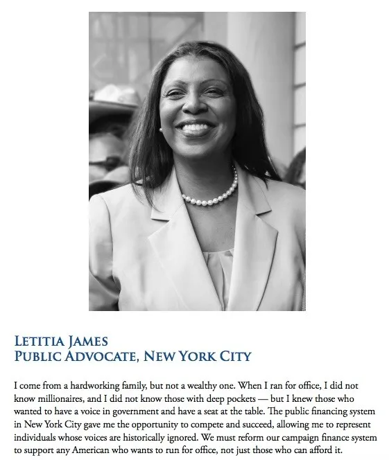 布伦南中心的研究人员与全国20位通过公共融资竞选模式当选的多样化官员进行了交谈——这些都是这些系统有效性的活生生的证据。这是来自纽约市的莱蒂西亚·詹姆斯,在布伦南报告中被提及:
