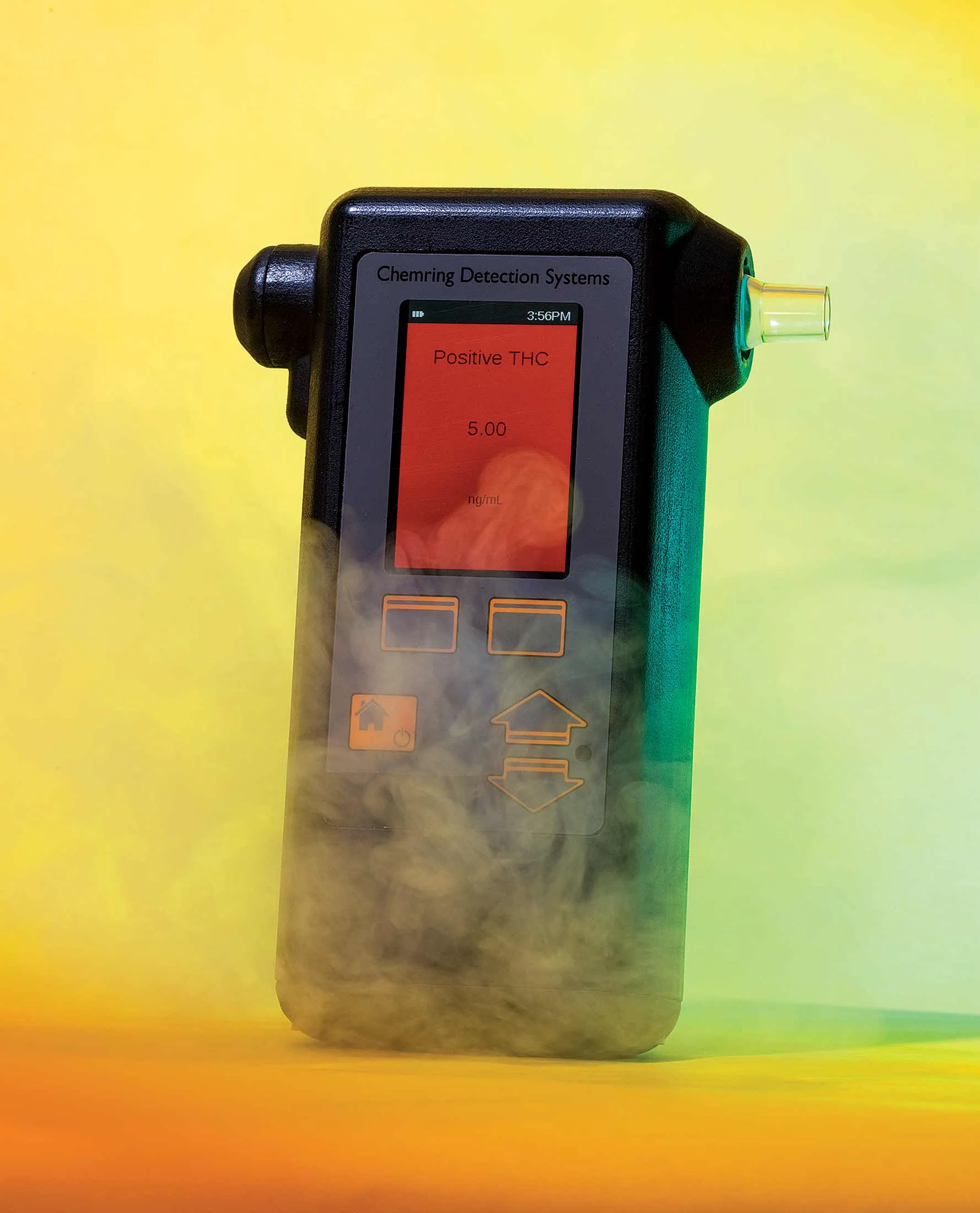 WSU团队正在开始另一组测试,以将实验室中发现的THC水平与医院抽取的血样进行关联。“这将非常有价值,”Chemring的首席技术官Okamitsu说。“这让我可以查看我们能检测到的最小THC量。”他的团队与Hill每周交流,Chemring希望在这个秋季为警察提供一个呼气测试仪原型进行现场测试。他们最新的模型看起来有点像老式的Game Boy,嫌疑人被要求吹气到侧面一个本该是音量旋钮的管子里。