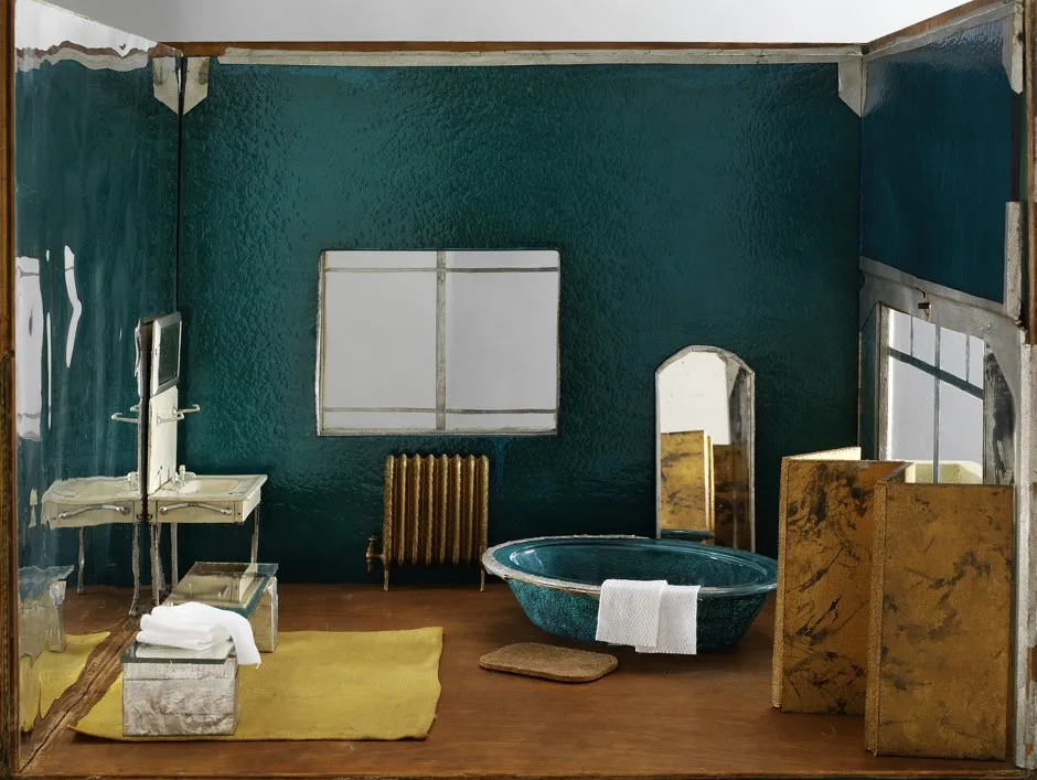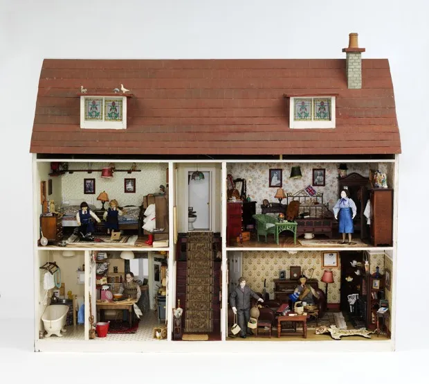 其他艺术家则利用玩偶屋作为创建自己生活剪贴簿的方式,同时将其置于更广泛的文化背景中。在50年的时间里, 罗马·霍普金森 painstakingly recreated the ephemera of WWII-era England in exacting detail: small portraits of her family are fastened in frames and photo albums; gas masks are snug in their cases; ration books are stacked in the kitchen. 结果的玩偶屋(如下)既是对她家庭经历的致敬,也是国际危机的记录。