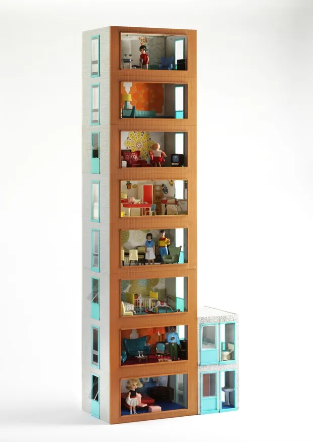 霍普金森之家(设定在1940年代)。 英国,1980年代-1990年代维多利亚和阿尔伯特博物馆,伦敦玩具屋的风格也映射出建筑模式的变化。高层公寓建筑的普遍性在1960年代盛行的叠加风格中显而易见。装饰不同,但习惯也不同:居民不再是遍布网球场和游泳池的广阔庄园,而是局促的居住空间,电视则暗示了一种更久坐和孤独的消遣方式。